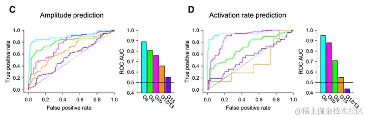 振幅 (C) 和激活率 (D) 预测的 ROC 曲线