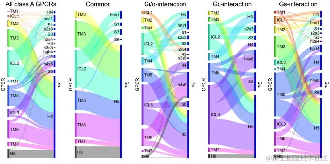 GPCRs 与 Gαi/o 和 Gαq 家族的蛋白偶联模式类似,唯一的区别在于 GPCRs 与前者的连接严重依赖 TM6,而与后者的连接则不需要。GPCRs 与 Gαs 的连接当中,ICL2 和 ICL3 的份额大幅减少,而更依赖 TM3 和 TM5。上述结果说明,对于不同家族的 Gα 蛋白而言,其与 GPCRs 的连接依赖于不同的结构。