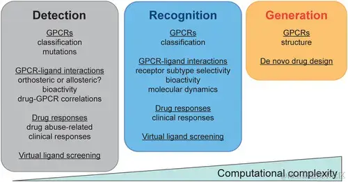 鉴于 AI 在 GPCR 药物研究中的应用的不断增加,对应的算法也不断被开发。对于分类问题,最常用的算法是传统机器学习领域的常用算法,如 scikit-learn 库中的算法,包括支持向量机 (SVM)、决策树、梯度提升机和 k-近邻算法等。