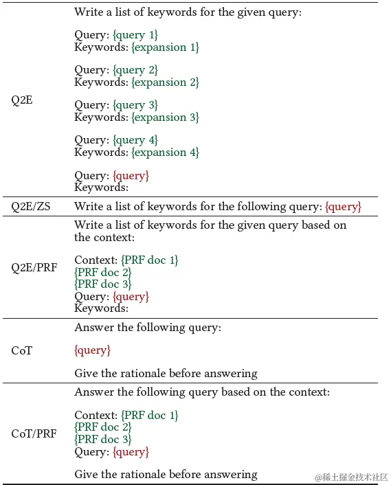 谷歌也做了类似的尝试。分别对比了Query2Doc(Q2D), Query2Keyword(Q2E), Query2COT几种改写方案,以及使用zero-shot,few-shot,召回文档增强等不同prompt指令的效果。其中Query2Doc采用了和上面微软相同的prompt指令,其他指令如下