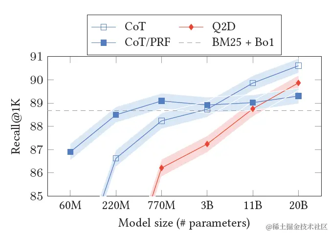 结果显示,当模型规模足够大之后,Query2COT展现出了显著更优的效果。甚至超越了在上文中加入相关文档的COT/PRF 方案。一方面COT会对Query进行多步拆解,一方面思考的过程会产生更有效的关键词,以及不使用相关文档可以更有效的释放模型本身的知识召回能力和创造力。