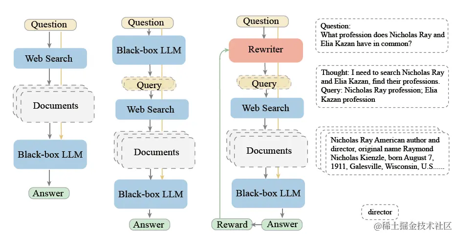 而在大模型时代,改写模块被升级为LLM。在微软提出的rewrite-retrieve-read框架中,使用大模型作为rewriter,Bing搜索作为Retriever,chatgpt作为Reader,在QA任务上,尝试使用PPO微调改写模型,Reward模型的目标是不同改写query召回后推理内容和真实答案的Exact Match和F1。不过真实场景中,这种有标准答案的QA问答其实占比很小,更多都是开放式问答。那么其实可以类比以上的传统方案,使用大模型推理的引用率,作为Reward目标。毕竟大模型选择哪几条输入的上文进行推理,和精排原理其实是相似的。