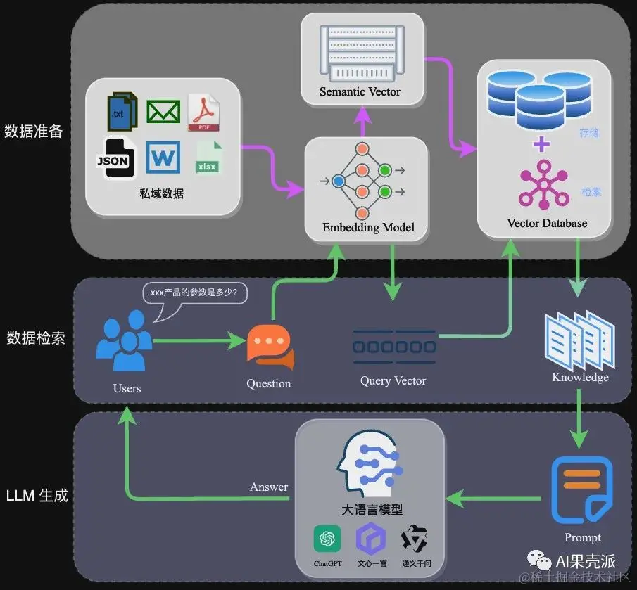 应用阶段:用户提问——>数据检索(召回)——>注入Prompt——>LLM生成答案