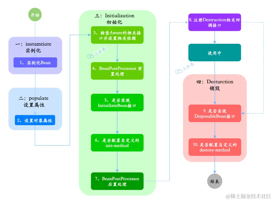 - 初始化:初始化分为几步,①检查Aware相关接口并且设置依赖;②调用BeanPostProcessor方法,进行前置处理;③是否实现initailizinBean接口;④是否重写init-method方法;⑤调用BeanPostProcessor,进行后置处理(⑥注册Destruction销毁方法的回调接口)]
