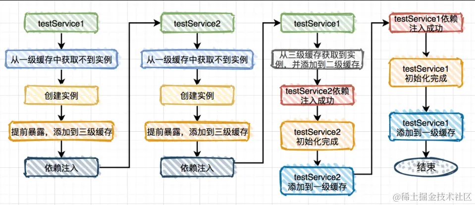 - A继续属性注入,从以及缓存中找到B顺利注意,完成剩下的步骤。