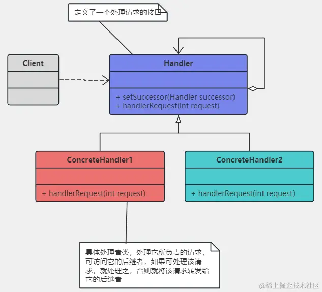 - 具体处理者:实现具体的处理方法即可,如果能处理就处理,不然就将处理交给下一个 Handler