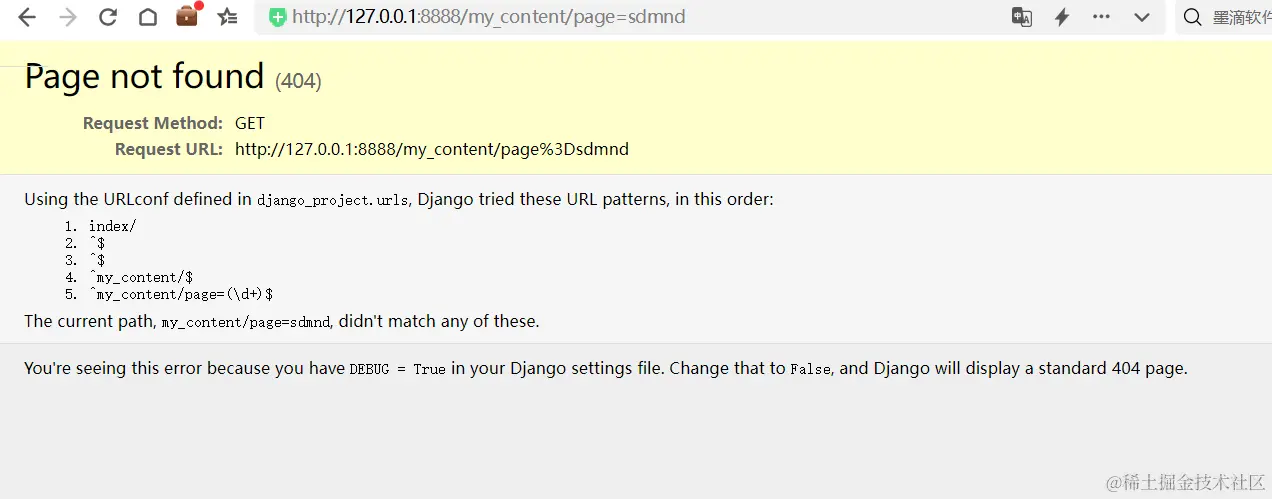 这个报错,主要是因为Django设置文件setting.py里面有个参数 DEBUG = True,将其更改为False,Django将显示标准的404页面。