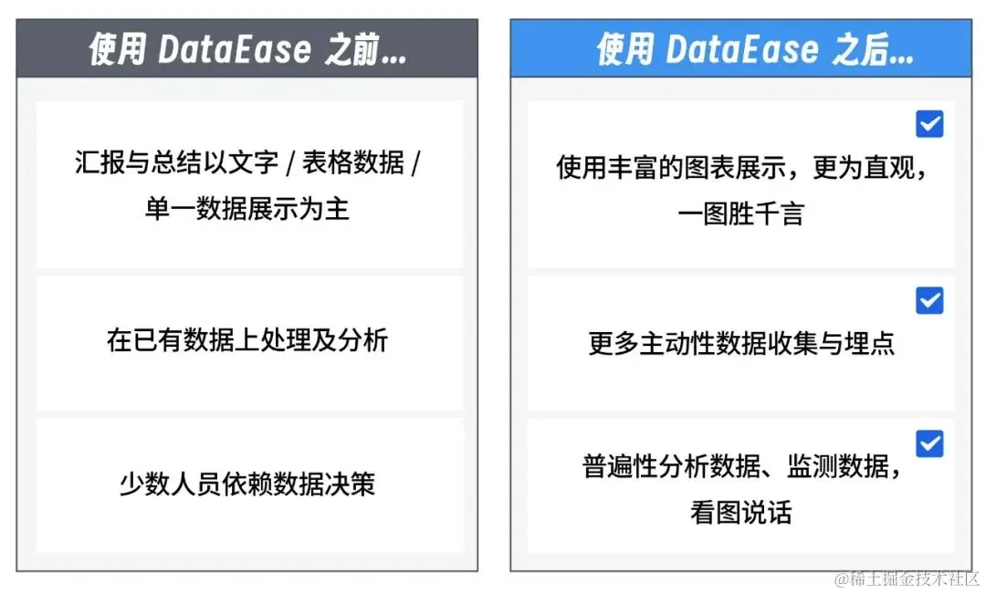 2. 使用DataEase前:数据来源零散,员工相互之间习惯性使用Excel传数;使用DataEase后:数据由DataEase统一接入,按权分配,统一平台查看,安全方便且数据一致性得到保证。
