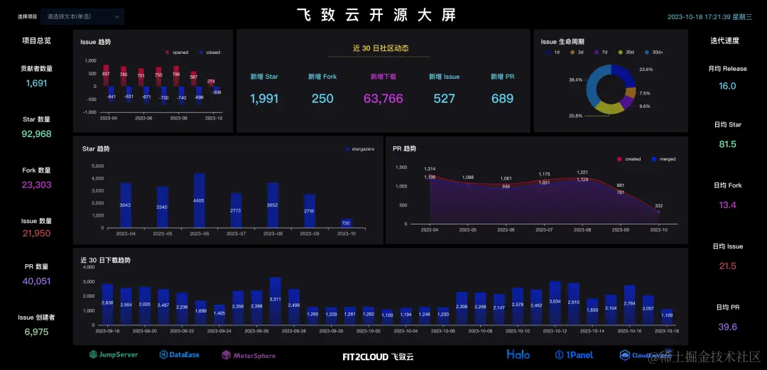 ■ 飞致云开源大屏:展示了飞致云旗下多款开源产品的GitHub数据。除了可以在官网访问飞致云开源大屏外,市场部也会按月导出该大屏,并将其发布到《飞致云开源社区月度动态报告》中。