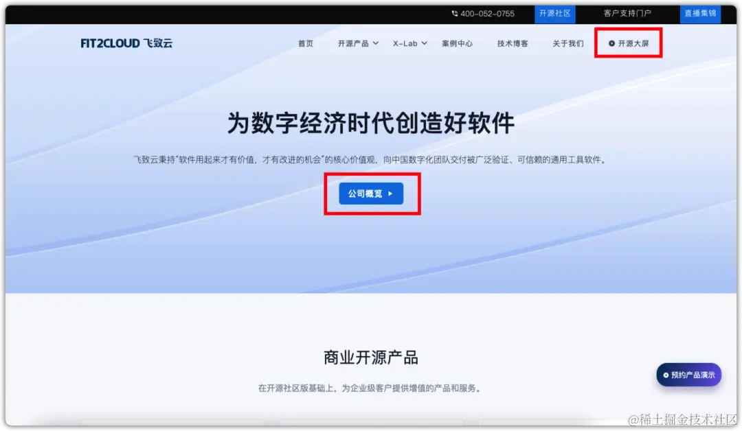 浏览飞致云官网(www.fit2cloud.com/ ),您会发现以下两个入口:“公司概览”与“开源大屏”。从这两个入口可以分别进入到通过DataEase制作的两个数据大屏下。这两个大屏均使用了公共链接进行分享,便于用户免登录访问。