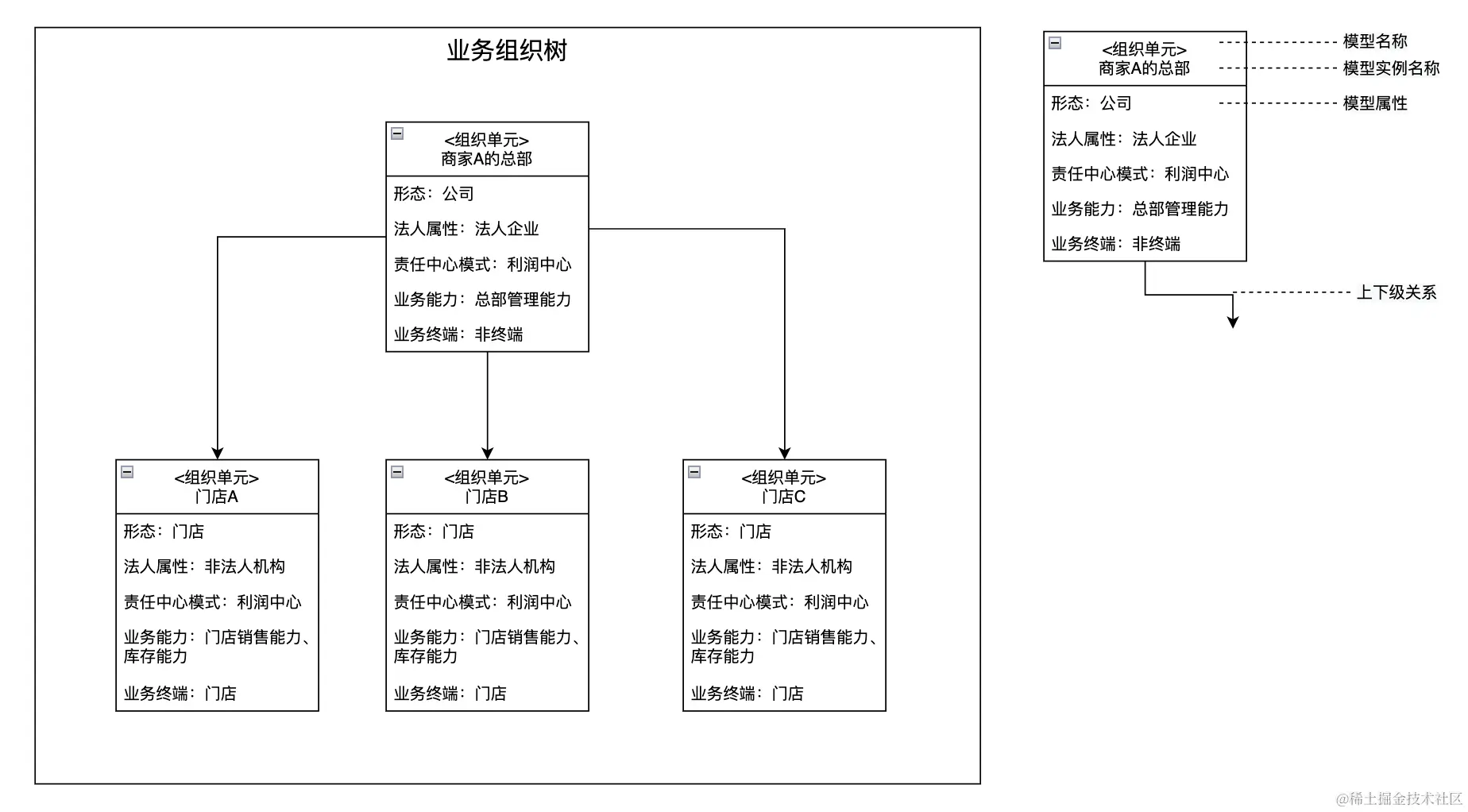 组织单元的法人属性:明确组织单元的法人属性,包含:法人企业(形态=集团、公司)、法人分支机构(形态=分公司、加盟商)、非法人机构(形态=事业部、部门、门店等)。