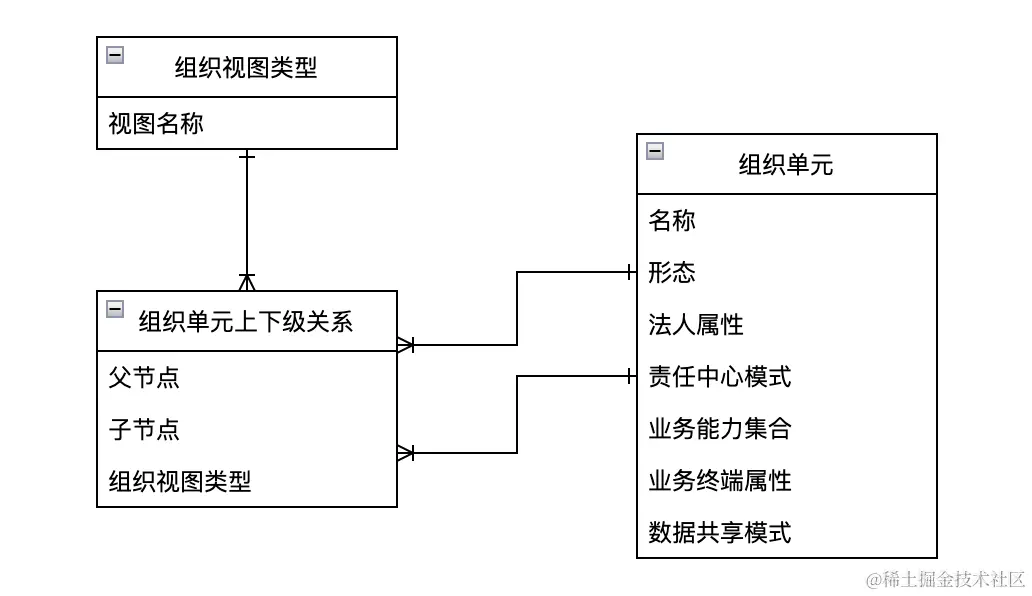 - 组织树:组织单元通过上下级关系联系在一起,就形成了一颗组织树,组织树需要明确关联一种组织视图类型。