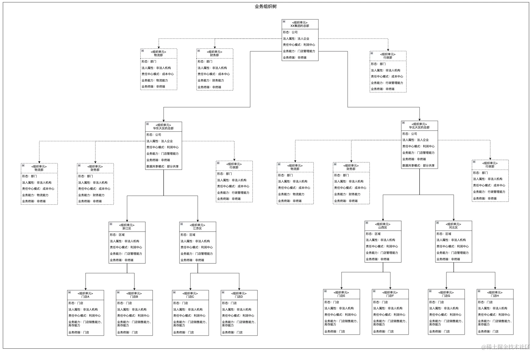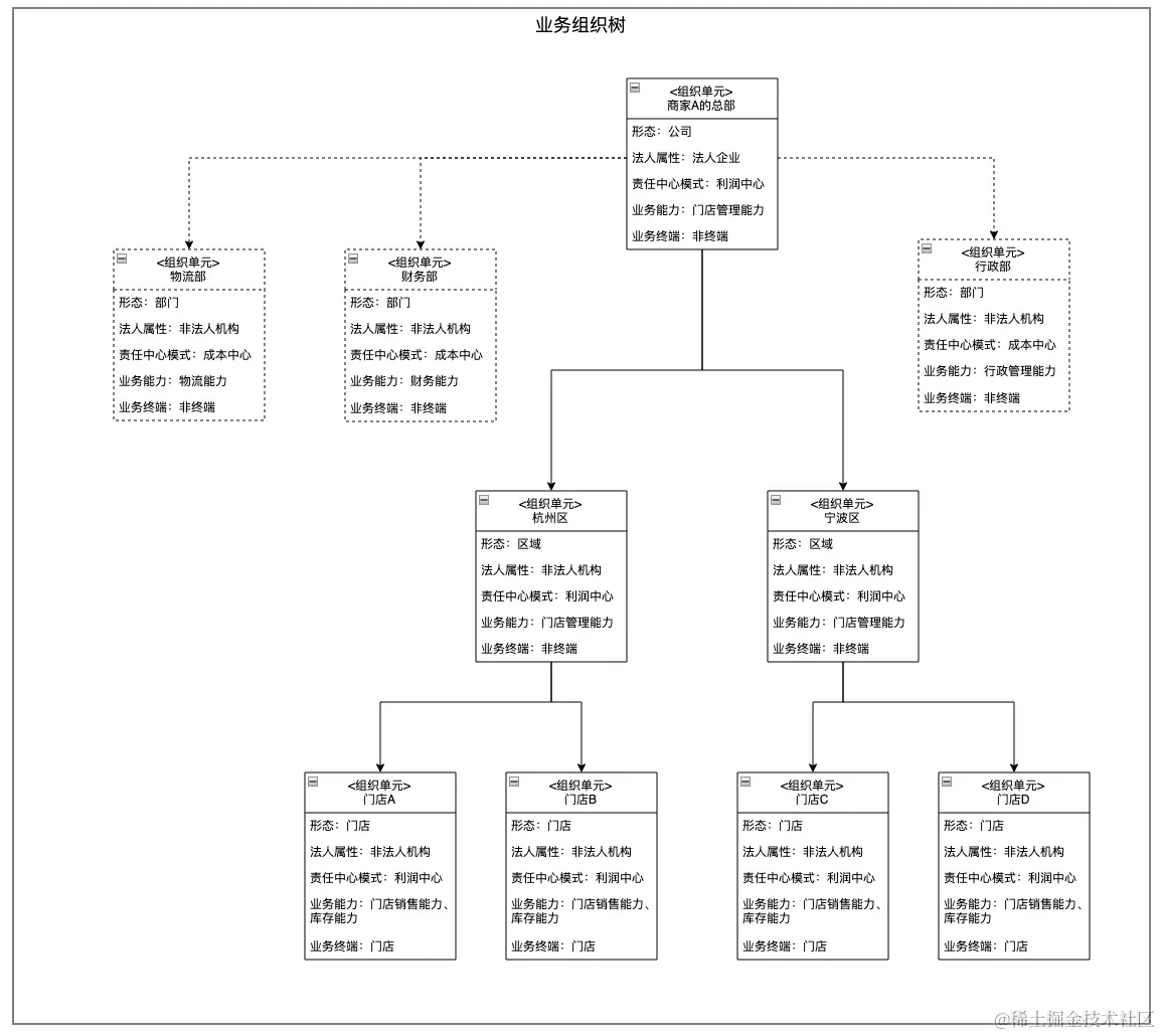组织单元的业务终端属性:如果组织单元是业务终端,一是代表该节点是组织树的叶子节点,二是代表该节点直接从事一线的业务活动。业务终端的典型形态就是门店、电商网店、配送中心。
