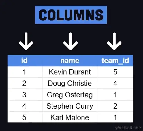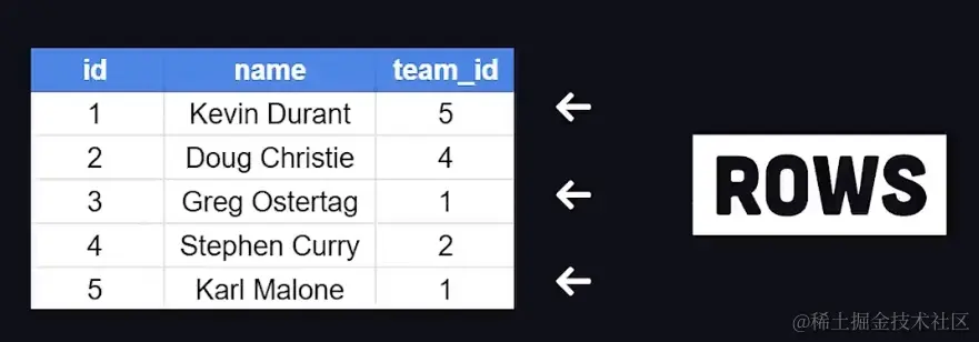 每行代表一个单独的记录或数据点,具有自己的唯一 ID(称为主键)。
