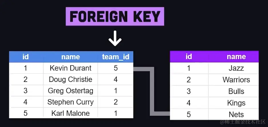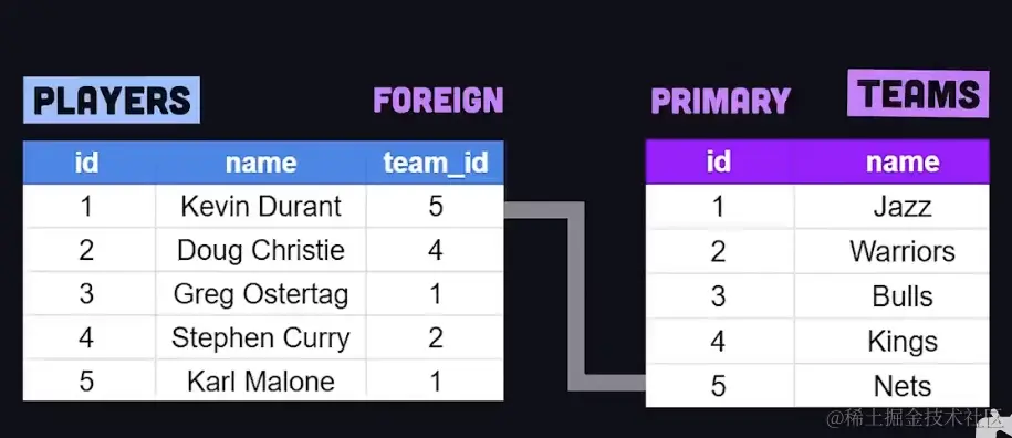 在球队表中,球队ID是主键,但在球员表中,它是外键。
