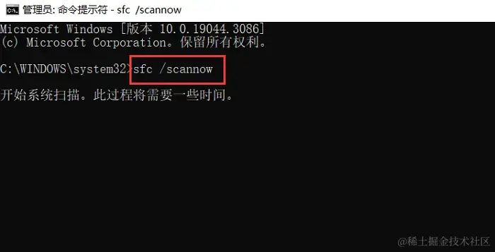 第二步:打开命令提示符(以管理员身份运行),输入 “sfc /scannow” 命令并按Enter键。
