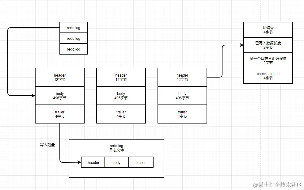 redo log block 大小是512字节,12字节header,496字节是body,4字节是trailer