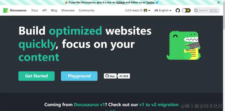 Docusaurus 是一个静态站点生成器。它构建了一个具有快速客户端导航的单页应用程序,利用React的全部功能使您的站点具有交互性。它提供开箱即用的文档功能,但可用于创建任何类型的网站(个人网站、产品、博客、营销登录页面等)。