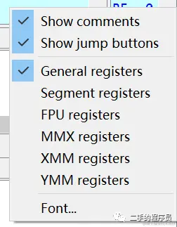 3 窗口是寄存器窗口,默认显示通用寄存器,但是我们可以在窗口空白位置右键,查看其他寄存器:
