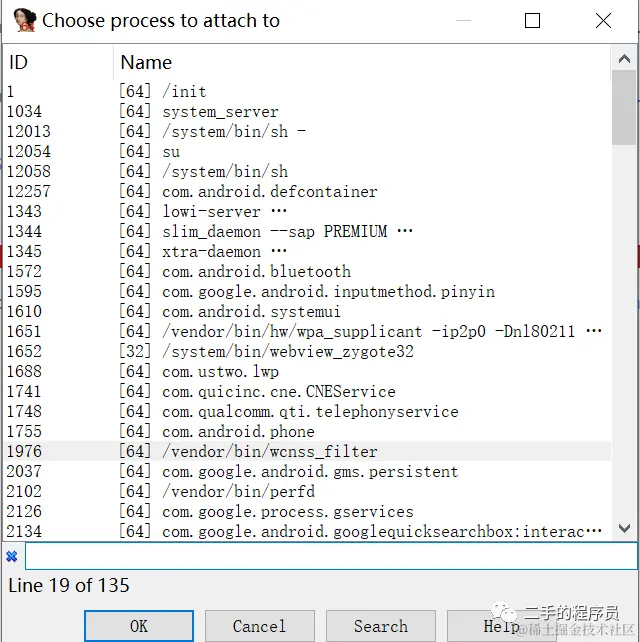 Ctrl + F 搜索目标进程名,选中进程,点击OK即可。经过一段时间的等待(主要是我用的 wifi adb),IDA 弹出一个窗口,询问它在进程找到的 so 是不是你想调试的那个 so,点击 same 就ok了。