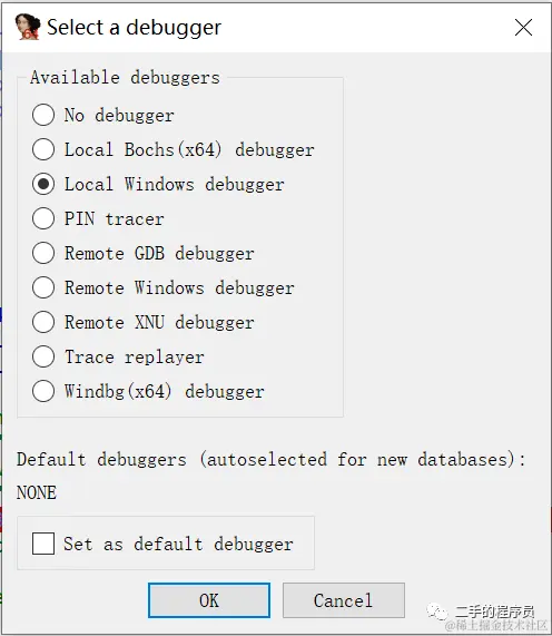 由于 IDA 可以调试的程序类型非常之多(但是每个的操作都是统一的,没有学习成本,很吊啊),所以在调试前,我们需要选择调试器的类型: