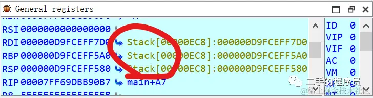 如果我们想跳转到栈顶,可以点击通用寄存器中的 rsp 的蓝色拐弯箭头,栈底就是 rbp 咯。