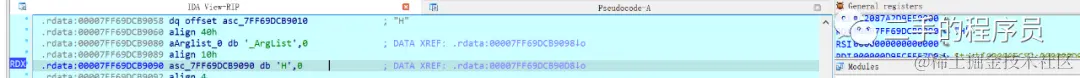寄存器的右边有的会有一个蓝色的拐弯箭头,这个可以用来跳转到具体的地址位置,比如,我先在 IDA View-RIP 窗口里鼠标左键点一下: