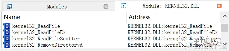5 窗口是当前进程中加载的模块列表,双击其中任何一个,可以看到该模块的导出函数。