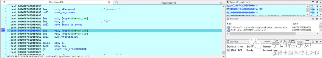 在静态分析篇中 ,我们在示例文件中猜测 sub_140001834 这个函数是将用户的输入存放到一个字符数组中,现在我们就可以使用动态调试来验证一下我们的猜想。