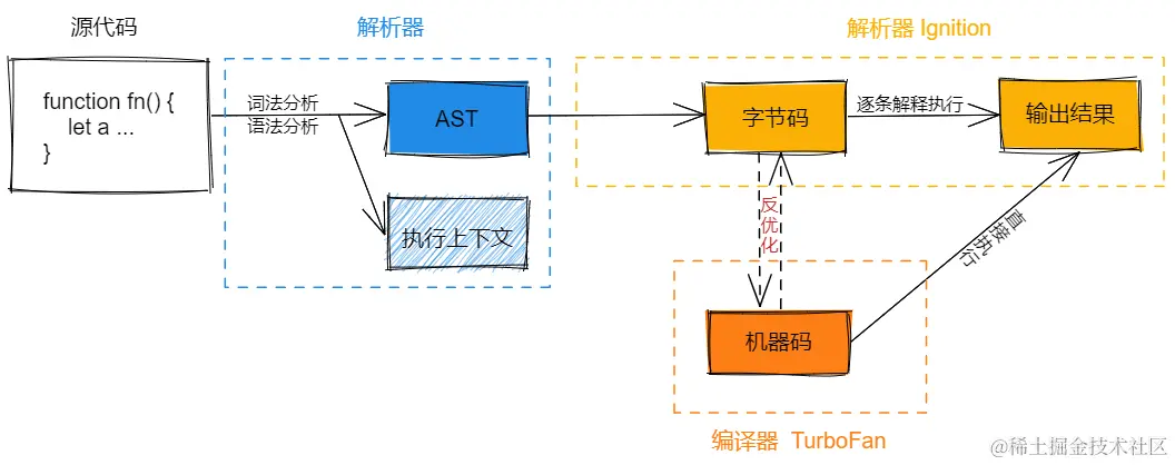 对于一段第一次被执行的字节码,解释器 Ignition 会逐条解释并执行。在执行的过程中,如果发现热点代码(Hotspot),比如说一段被重复执行多次的代码,后台的 编译器 TurboFan 就会将该段热点字节码编译成机器码并保存起,当下次在执行到该段热点代码时,只需要执行编译后的机器码就行,这样就节提升了大量的执行效率。执行流程如下图所示: