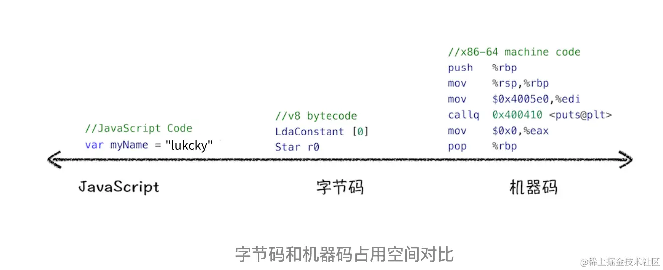 解释下字节码是什么,字节码是介于AST和机器码之间的一种代码,字节码需要解释器将其转化为机器码之后才能执行。为了更好的去理解字节码,下面是源码、字节码、机器码的一个对比图: