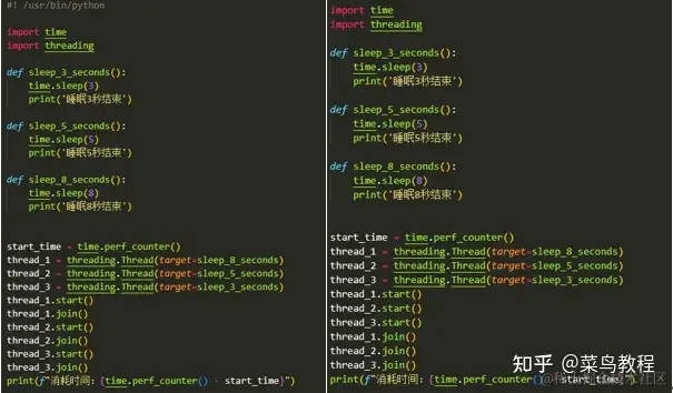 当代码执行到thread_1.join()时,当前三个子线程均已经执行过.start()方法了,所以此时主线程虽然卡住了,但是三个子线程会继续运行。其中线程3先结束,然后线程2结束。此时线程1还剩3秒钟,所以此时thread_1.join()依然是卡住的状态,直到线程1结束,thread_1.join()解除阻塞,代码运行到thread_2.join()中,但由于thread_2早就结束了,所以这行代码一闪而过,不会卡住。同理,thread_3.join()也是一闪而过。所以整个过程中,thread_2.join()和thread_3.join()根本没有起到任何作用。直接就结束了。 所以,你只需要 join 时间最长的这个线程就可以了。时间短的线程没有 join 的必要。根本不需要把这么多个 join 堆在一起。 为什么会有 join 这个功能呢?我们设想这样一个场景。你的爬虫使用10个线程爬取100个 URL,主线程需要等到所有URL 都已经爬取完成以后,再来分析数据。此时就可以通过 join 先把主线程卡住,等到10个子线程全部运行结束了,再用主线程进行后面的操作。 那么可能有人会问,如果我不知道哪个线程先运行完,那个线程后运行完怎么办?这个时候是不是就要每个线程都执行 join 操作了呢? 确实,这种情况下,每个线程使用 join是合理的: