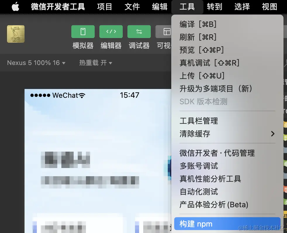 工具上方菜单: 工具 —> 构建npm