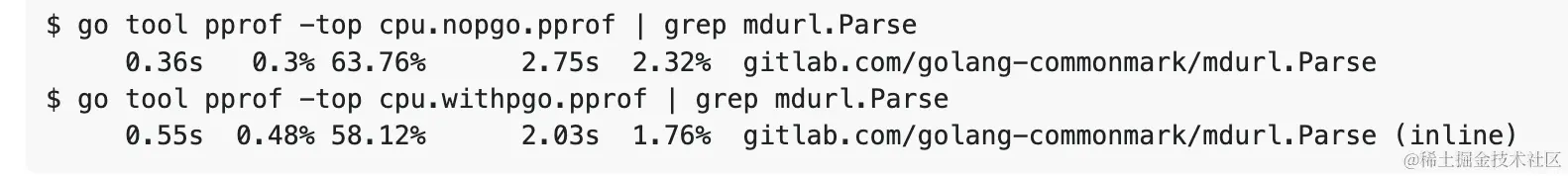 比较cpu.nopgo.pprof和cpu.withpgo.pprof能看到mdurl.Parse被内联优化了