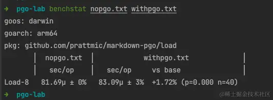 运行经过pgo优化的二进制程序./markdown.withpgo,同样执行go test github.com/prattmic/markdown-pgo/load -bench=. -count=40 -source $(pwd)/README.md > withpgo.txt