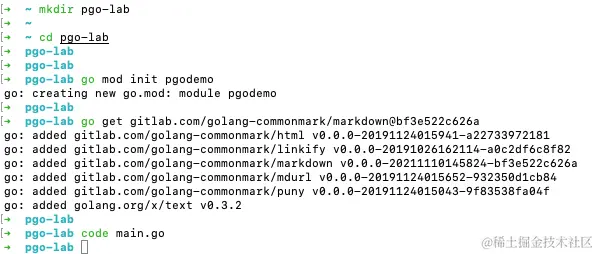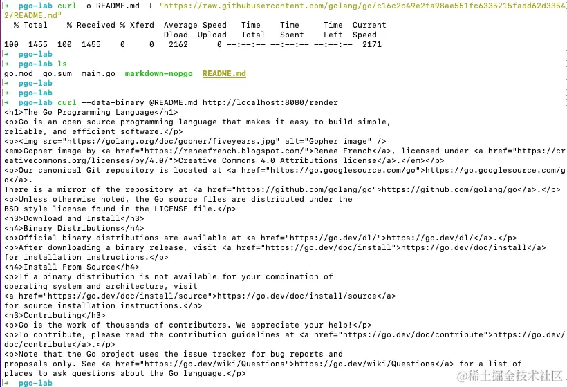 另起一个终端窗口,找一个markdown格式的文档,此处以 Go 项目中的 README.md为例, 获取该README.md: curl -o README.md -L "https://raw.githubusercontent.com/golang/go/c16c2c49e2fa98ae551fc6335215fadd62d33542/README.md"