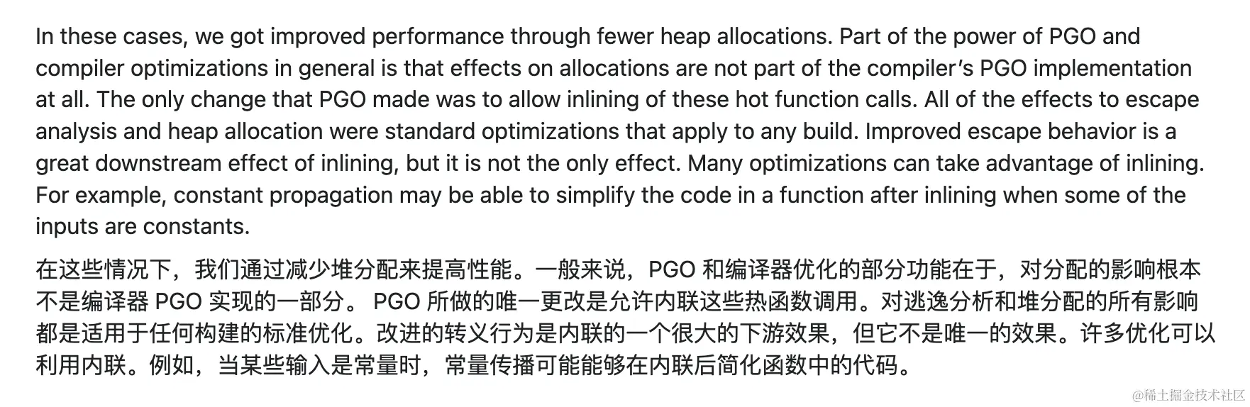 详细过程参考官方原文的differential profiling(差异分析) --- 即 在程序运行时获取了优化前和优化后的cpu及heap(主要看总分配计数,即 go tool pprof -sample_index=alloc_objects)相关的pprof文件,然后通过 go tool pprof -diff_base cpu.nopgo.pprof cpu.withpgo.pprof 进行对比