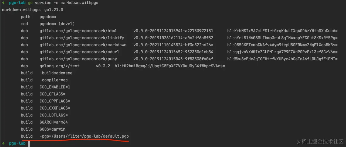 可以通过 go version -m markdown.withpgo 检查构建过程中是否启用了 PGO