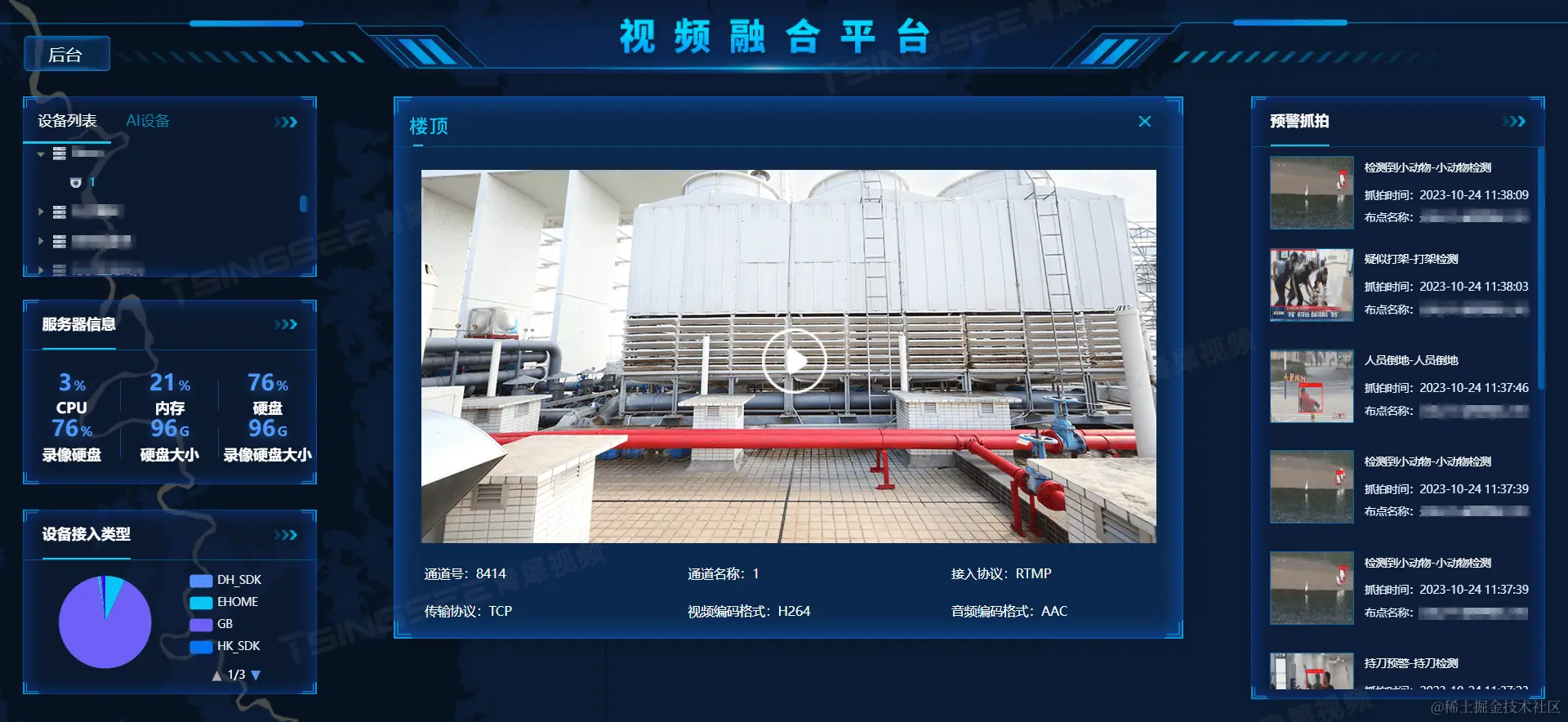 GB28181视频监控国标平台/视频监控EasyCVR能在复杂的网络环境中,将分散的各类视频资源进行统一汇聚、整合、集中管理。视频监控汇聚平台EasyCVR支持多种播放协议,包括:HLS、HTTP-FLV、WebSocket-FLV、WebRTC、RTSP、RTMP,并且支持对外分享。智能监控平台EasyCVR拓展性强,视频能力丰富,还可以实现服务器集群、语音对讲、云台控制、电子地图、H.265自动转码H.264、平台级联等能力。