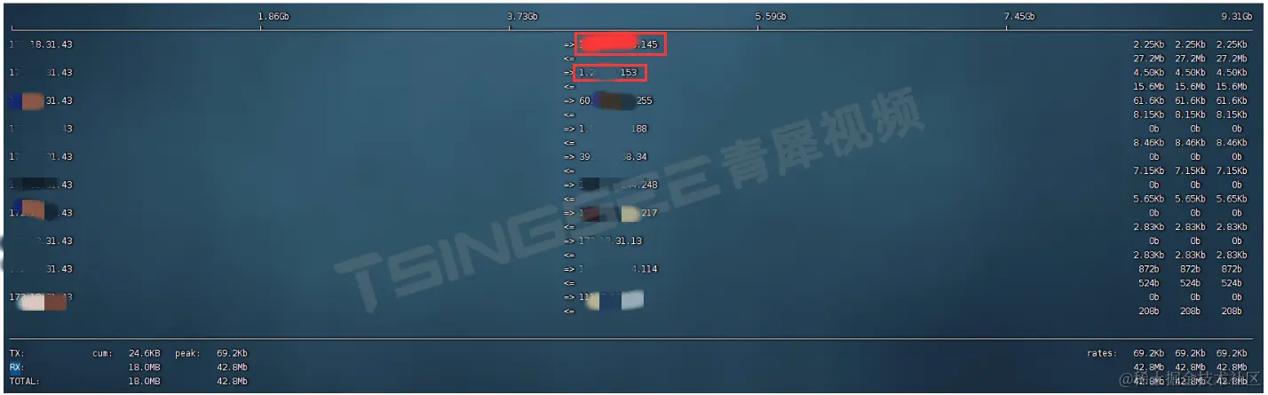 而在Linux系统中,还可通过命令iftop查看服务器的流量使用情况,以及哪些ip与服务器有信令交互信息,如下图: