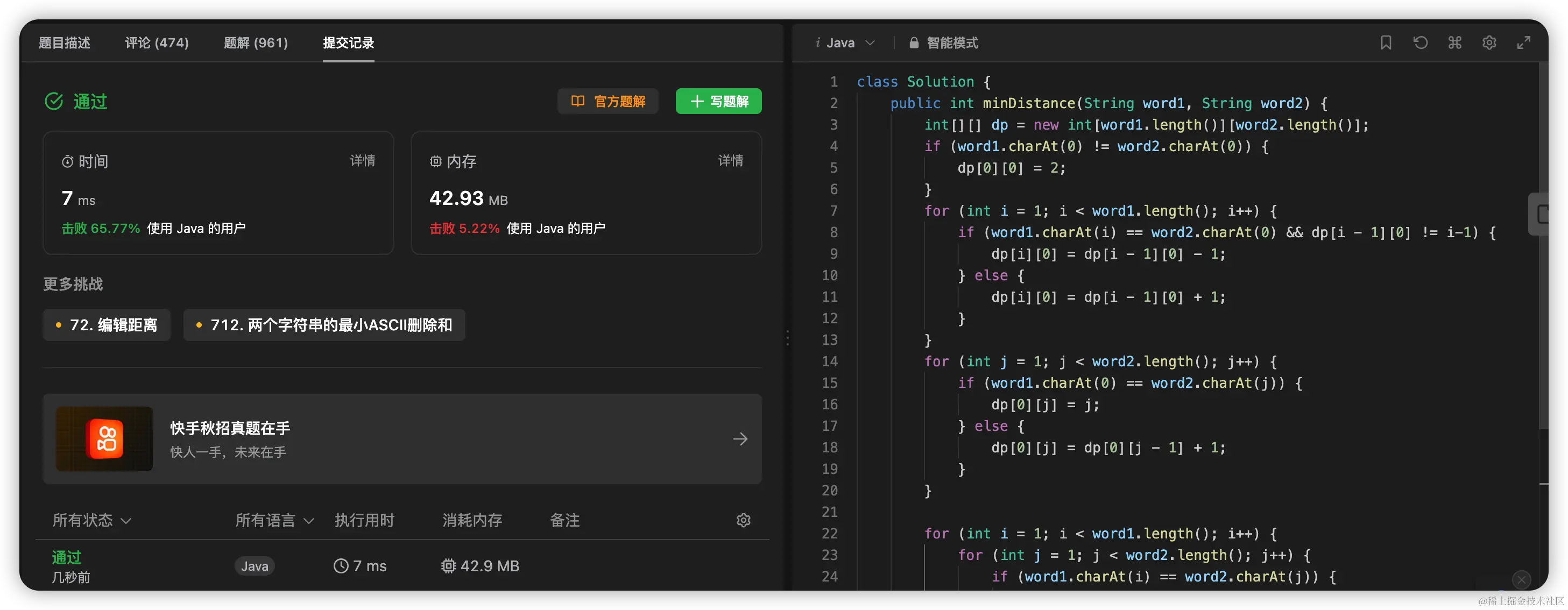 - 时间复杂度:O(n*m),其中 n 是word1的长度,m 是word2的长度