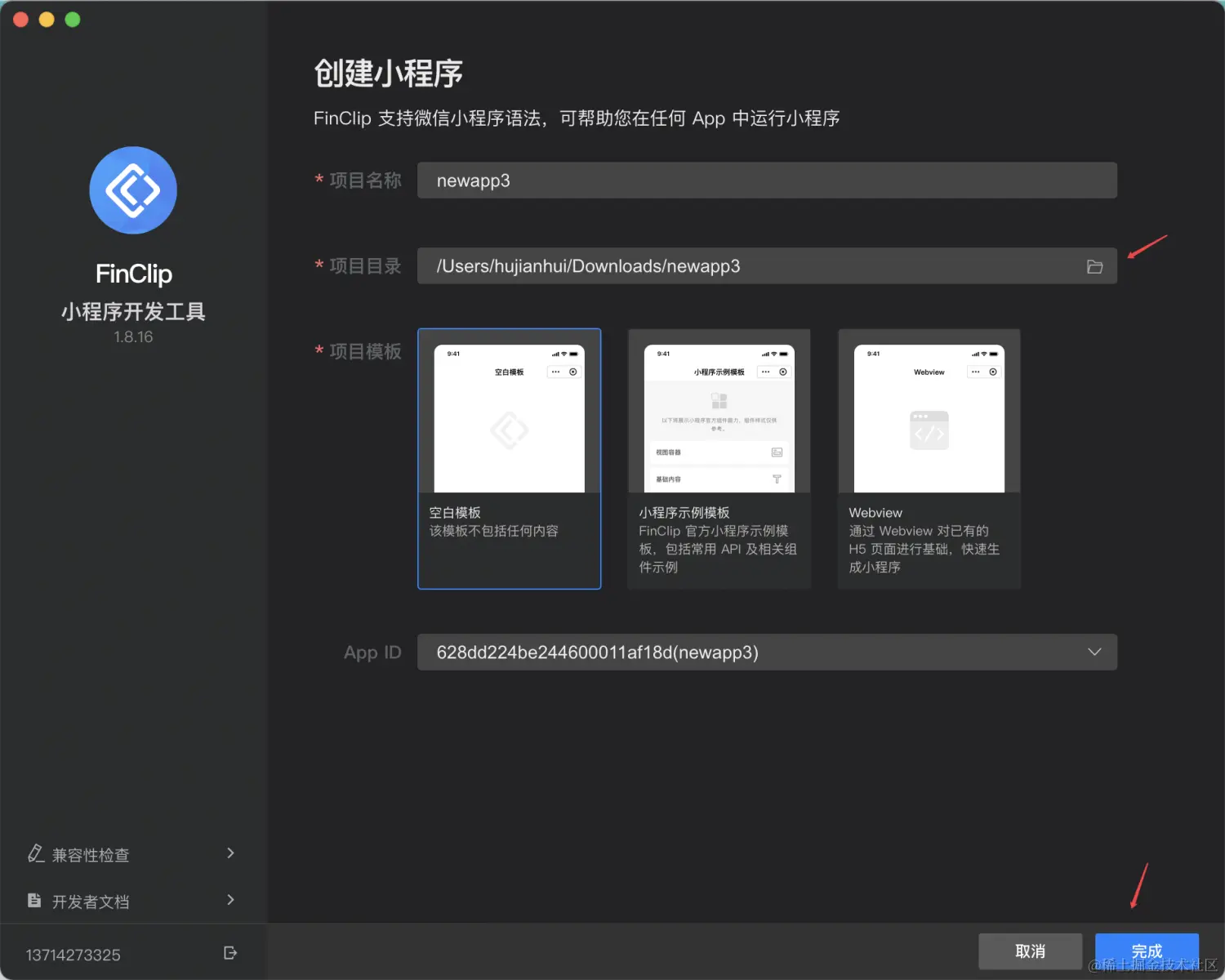 回到桌面,在下载一栏,新增一个空文件夹,命名它为newapp3。打开FinClip Studio开发工具,项目目录选择刚刚创建的newapp3文件夹,APP ID选择newapp3,然后点击完成。