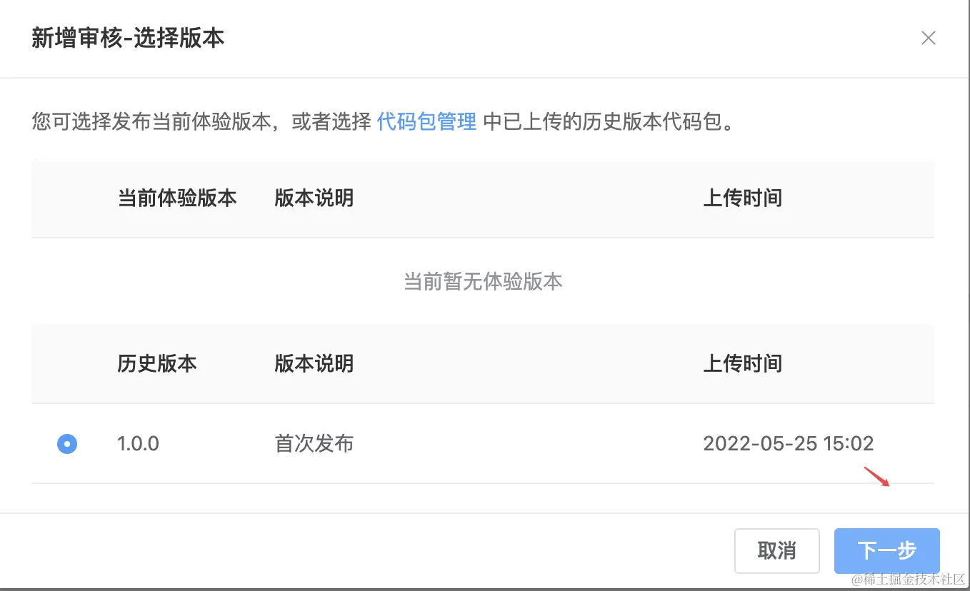 勾选刚刚上传的首次发布版本,点下一步->下一步->提交。