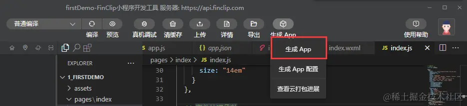 点击IDE的菜单栏生成APP->下一步->本地编译->下一步→选择相应APP ID->下一步->确认配置APP信息->下一步->导出目录->完成->等待导出。