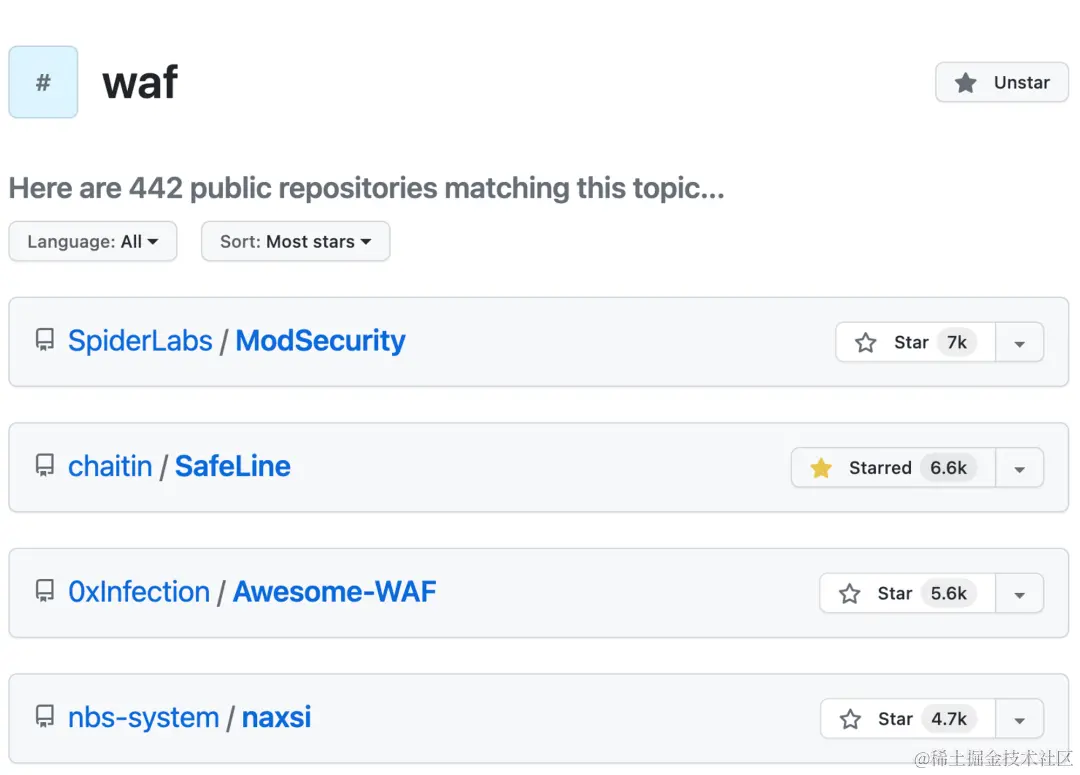 截止目前,GitHub 获赞 6.6k,成为了 GitHub WAF 榜单上全球排名第二的项目,终于能看到老前辈 ModSecurity 的背影了。