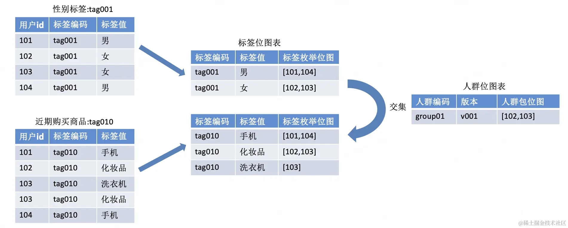 Bitmap 是一个二进制集合,用0或1标识某个值是否存在,使用Bitmap的特点和标签、人群结果的结构高度契合,正常1亿的人群包使用Bitmap存储只需要50MB左右。