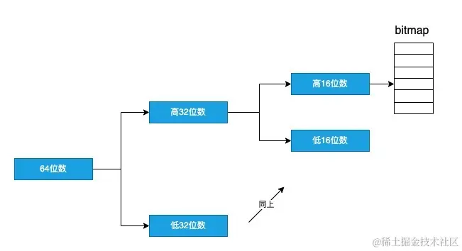在实际存储时,先把64位的数划分成高32位和低32位,建立一个我们称为Container的容器,同样的再分别为高低32位创建高16位和低16位的Container,最终可以通过多次二分查找找到offset所在的小桶。