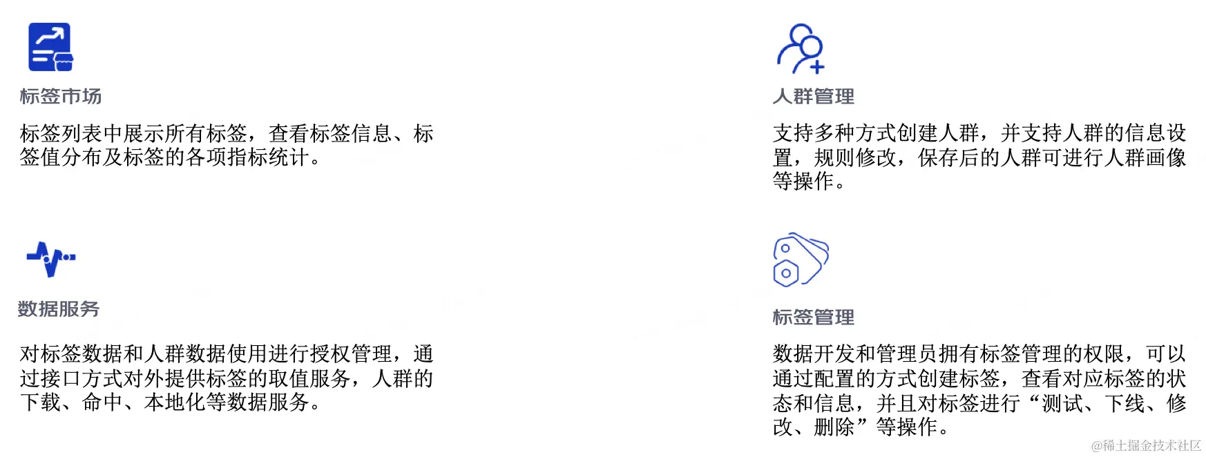 京东科技画像系统,提供标准的画像功能服务,包含标签市场、人群管理、数据服务、标签管理等,可以将用户分群服务于其他各个业务系统。