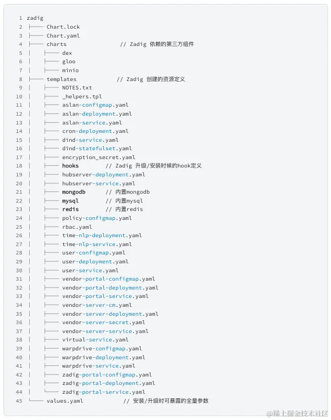 Zadig 使用标准 Helm 执行部署,组件资源以及配置均在 Chart 中定义,Chart 结构如下: