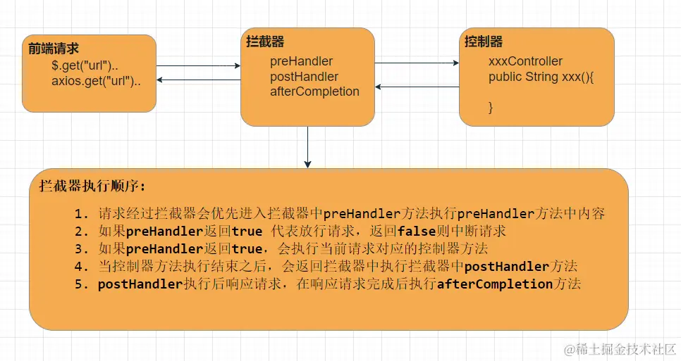 - 拦截器只能Controller的请求,不能拦截jsp、静态资源相关请求